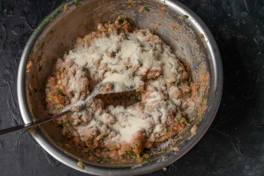 Все добре перемішуємо, якщо фарш рідкуватий, додаємо столову ложку манки і залишаємо на 10 хвилин, якщо густий, манка не потрібна.