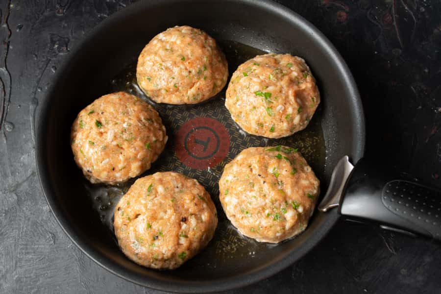 Нагріваємо сковороду, змащуємо олією, викладаємо тефтелі на невеликій відстані один від одного, не потрібно щоб вони торкалися – нехай буде побільше вільного місця навколо.