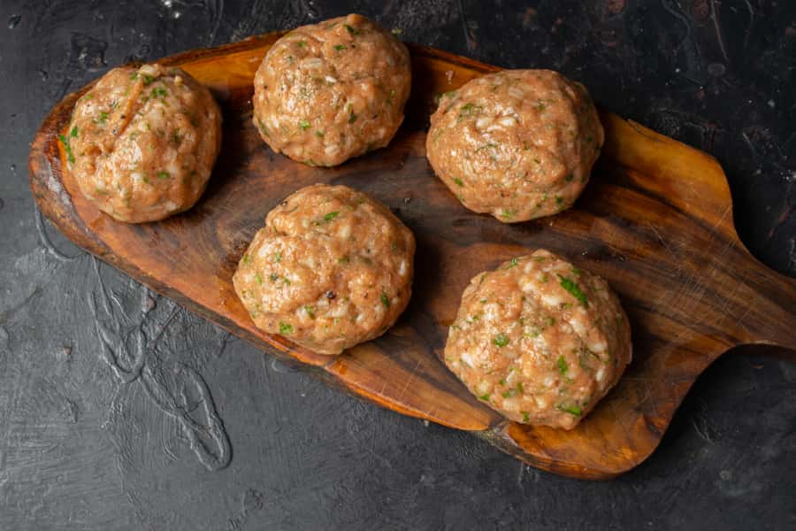 Змащуємо долоні олією, ліпимо круглі тефтелі. Із зазначених в рецепті інгредієнтів вийде 5-6 тефтелей.