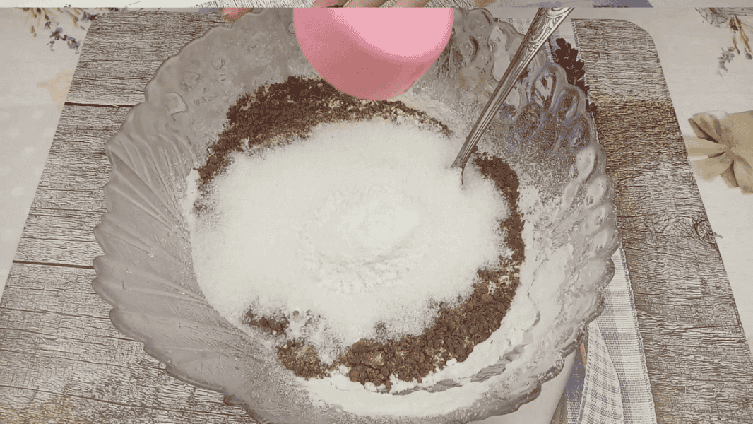 У миску просіюємо 1,25 склянки борошна, додаємо 3 ст. л. з гіркою какао, 1 скл. цукру і 1,5 ч. л. розпушувача. Перемішуємо.