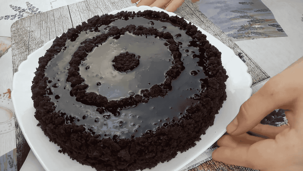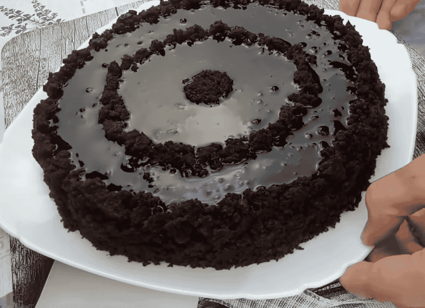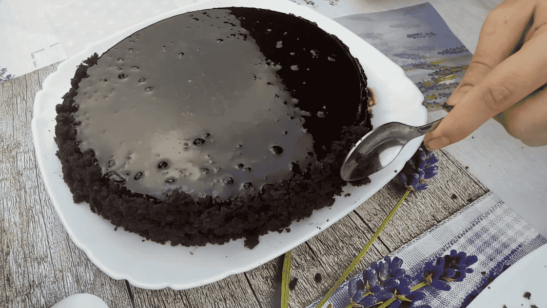 З бісквіта зрізаємо верхівку і перевертаємо. Зверху заливаємо гарячою глазур’ю. Також глазур’ю змащуємо боки бісквіта. Верхівку, яку ми зрізали подрібнюємо руками в крихту. Далі посипаємо крихтою боки і робимо малюнок зверху десерту.