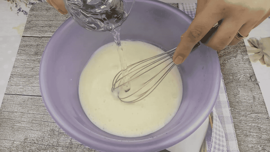 Окремо в миску виливаємо 0,5 склянки молока, 0,25 склянки олії і розбиваємо 1 яйце. Продукти збиваємо вінчиком, щоб зруйнувати структуру яйця. Далі цівкою порційно вливаємо 0,5 склянки окропу. В цей час продукти перемішуємо вінчиком.