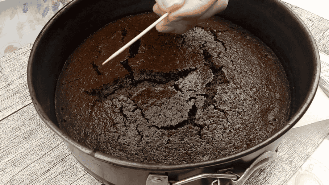 Дно і боки роз’ємної форми d-23 см змащуємо олією, також можна її злегка присипати какао. Виливаємо в неї тісто. Якщо форма протікає то з зовнішньої сторони дно і боки форми оберніть фольгою. Випікаємо тісто 20-25 хв при 180 * С до сухої зубочистки.