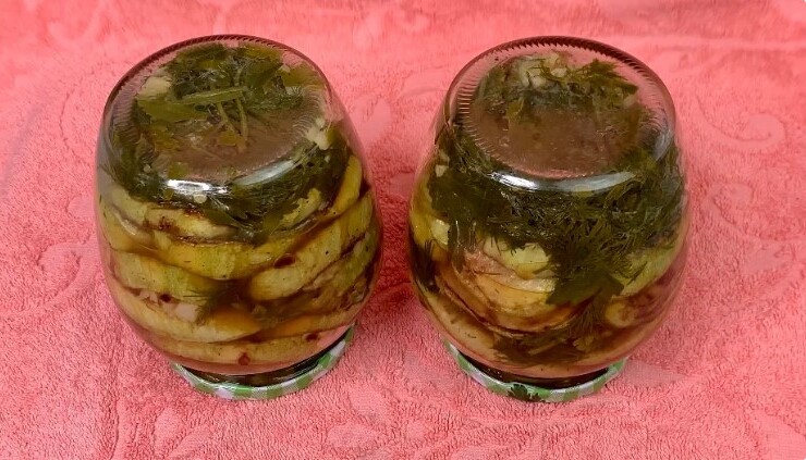 - Після стерилізації вливаємо 9% оцет, щільно закручуємо кришками, перевертаємо дном вгору, укутуємо в ковдру або рушник і залишаємо до охолодження.