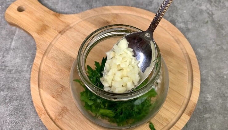 - У чисті баночки укладаємо зелень петрушки, кропу та дрібно нарізаний часник.