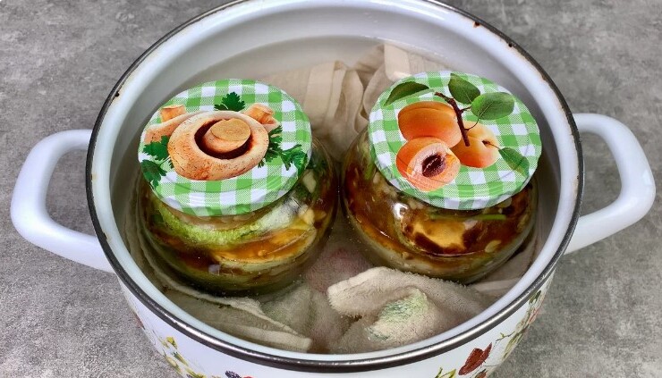 - Накриваємо кришками, дно каструлі застеляємо марлею або рушником, ставимо банки, заливаємо водою до плічок і стерилізуємо з моменту закипання 30 хвилин.