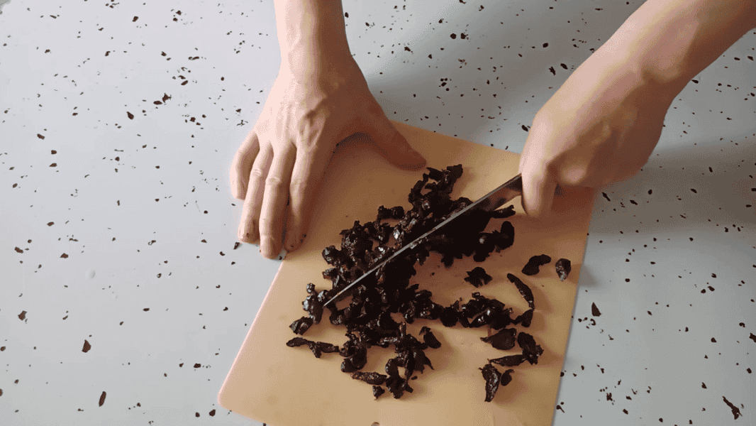 Чорнослив розрізаю на дуже дрібні фрагменти, гострим ножем.