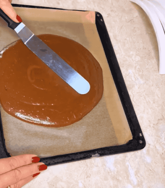 Далі виливаємо на деко застелене пергаментом, розрівнюємо рівномірно по формі.
