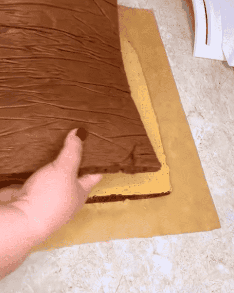 Збираємо торт. Викладаємо шоколадний бісквіт, далі промащуємо його кремом і накриваємо другим бісквітом.