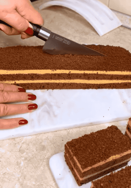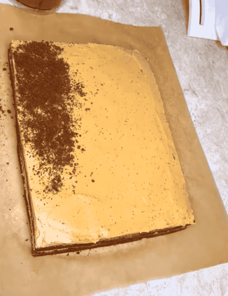 Далі змащуємо його повністю кремом і посипаємо подрібненою бісквітною крихтою.