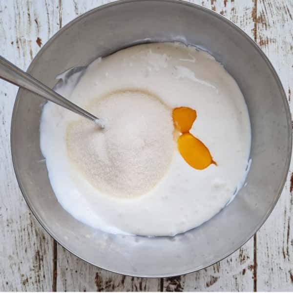 - Додати жовтки, розмішати, додати цукор, ванілін, розмішати, поступово всипати 2,5-3 склянкт борошна.