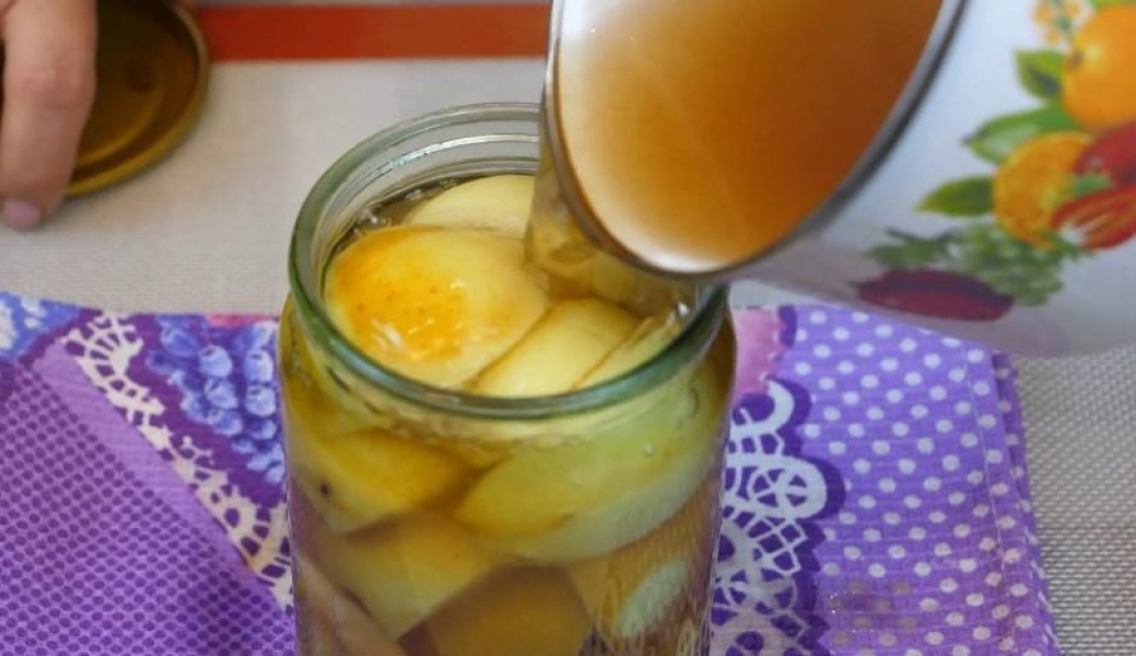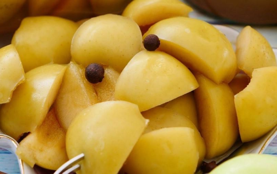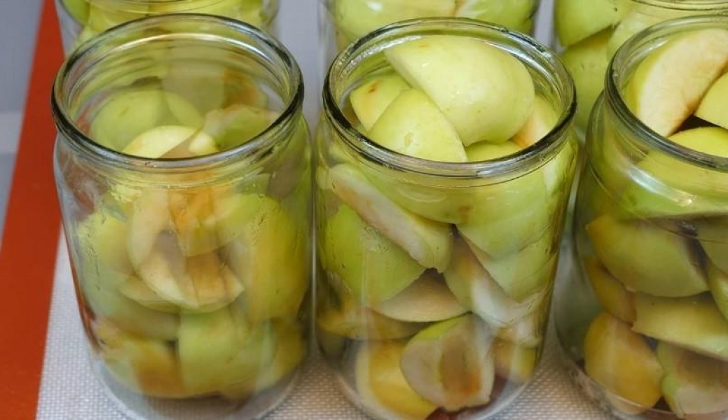 Злийте з яблук кислу воду, а шматочки фруктів покладіть в банки.