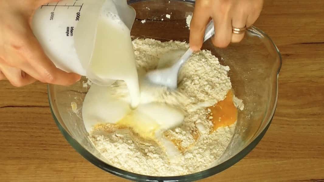 7. Додати яйце і кефір і замісити м’яке нелипуче тісто.