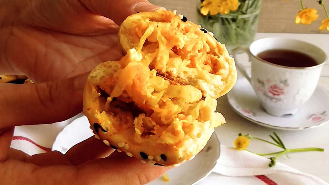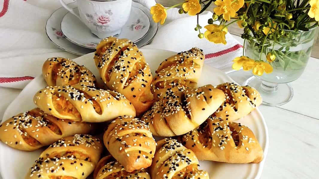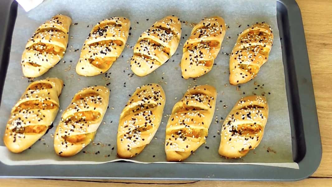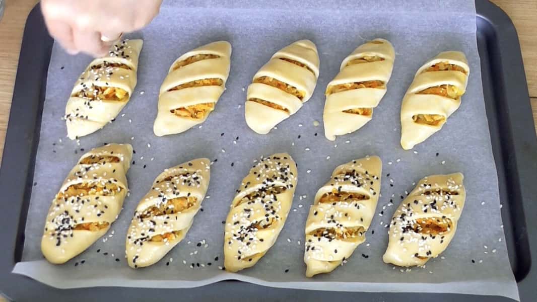 12. Перед випічкою пиріжки змастити яйцем або молоком, присипати кунжутом за бажанням. Випікати пиріжки з капустою в добре розігрітій духовці при 200 гр. С близько 30 хв. Дивіться на особливості своєї духовки!