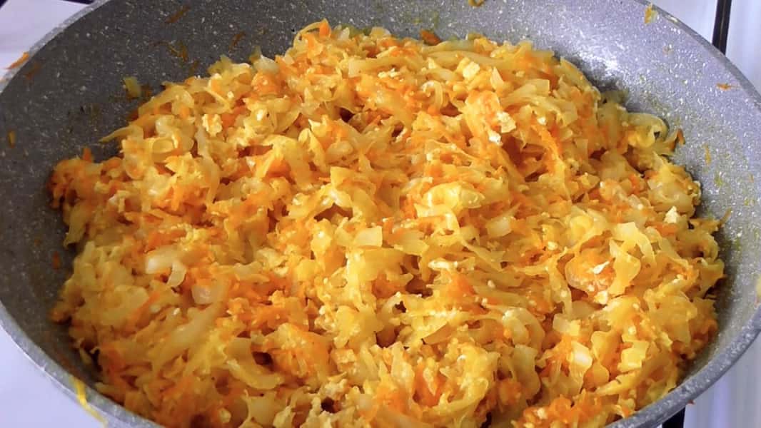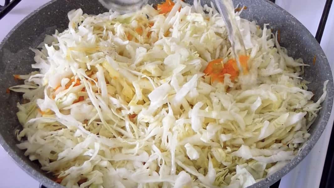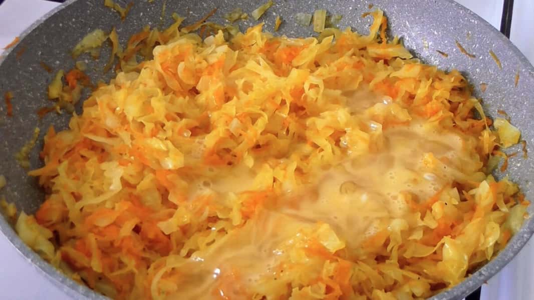 3. У готову капусту влити розбовтане яйце і відразу добре перемішати начинку, затушкувати ще 1-2 хвилинки.