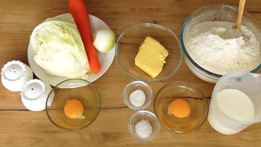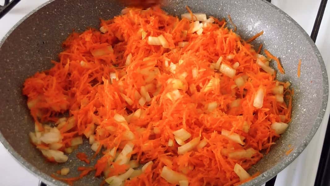1. Спочатку приготувати начинку. Цибуля дрібно нарізати, моркву натерти на дрібній терці, а капусту тонко нашаткувати. У сковороду налити 1-2 стол. ложки олії, викласти цибулю і моркву і обсмажити їх 1-2 хвилини.