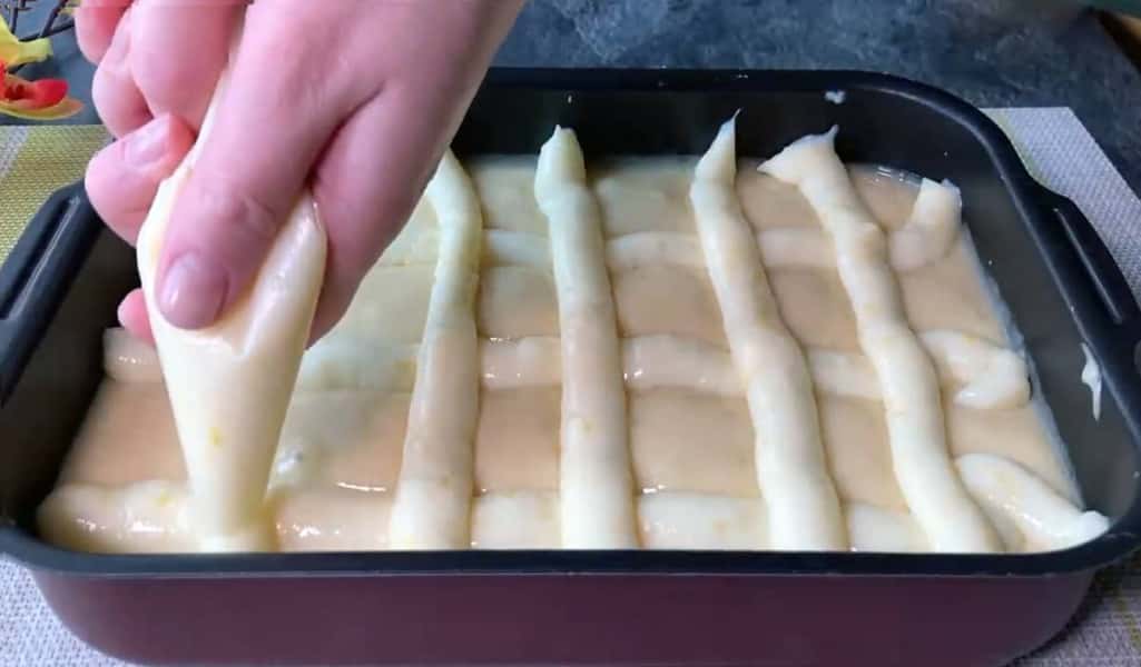 Помістіть крем в кондитерський мішок і розподіліть його на тісті у вигляді сітки.