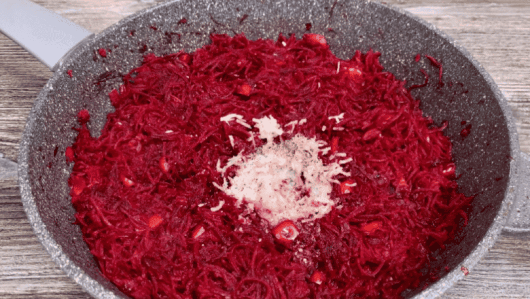 До овочів додаємо сирий тертий буряк, готуємо ще 3-4 хвилини, додаємо тертий часник, сіль, чорний мелений перець, яблучний оцет, перемішуємо, прибираємо з вогню і залишаємо під кришкою на 5 хвилин.