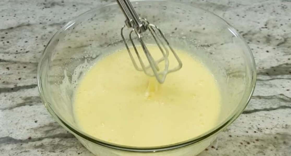 Збийте міксером 3 яйця, 120 г цукру та 0,5 ч. л. ванільного цукру. Маса має збільшитися вдвічі.