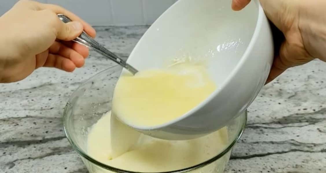 Змішайте дріжджі, 1 ст. л. цукру та 1 ст. л. борошна. Додайте 100 г розтопленого вершкового масла і 500 мл теплого молока, перемішайте. Потім з’єднайте із яєчною масою.