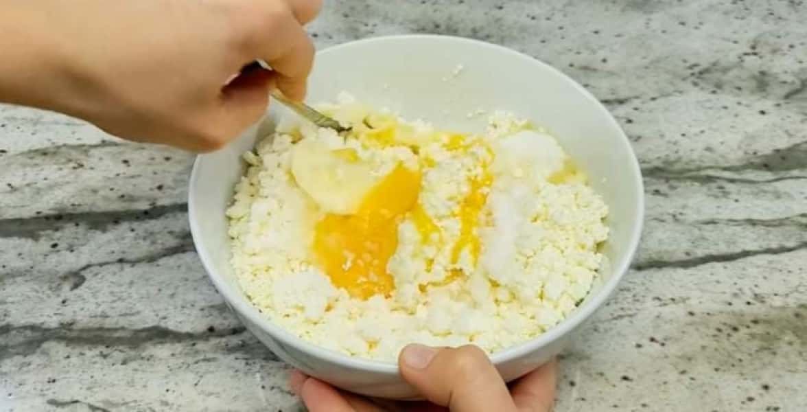 Змішайте сир з 180 г цукру, 2 ч. л. ванільного цукру, 4 яйцями, 2 білками та 60 г розм’якшеного вершкового масла. Залийте родзинки кип’ятком і залиште на 15 хвилин.