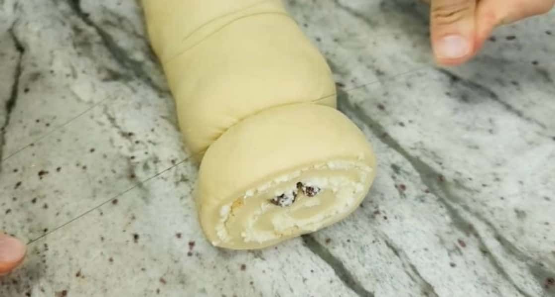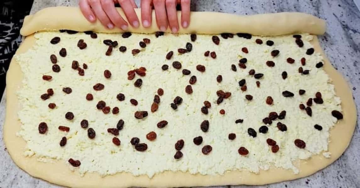 Розділіть тісто навпіл і розкачайте кожну частину в тонкий прямокутний пласт. Розподіліть сирну начинку і посипте родзинками. Скрутіть рулет, защіпніть краї і розріжте його на шматочки за допомогою нитки.