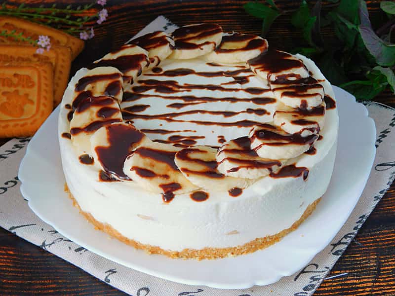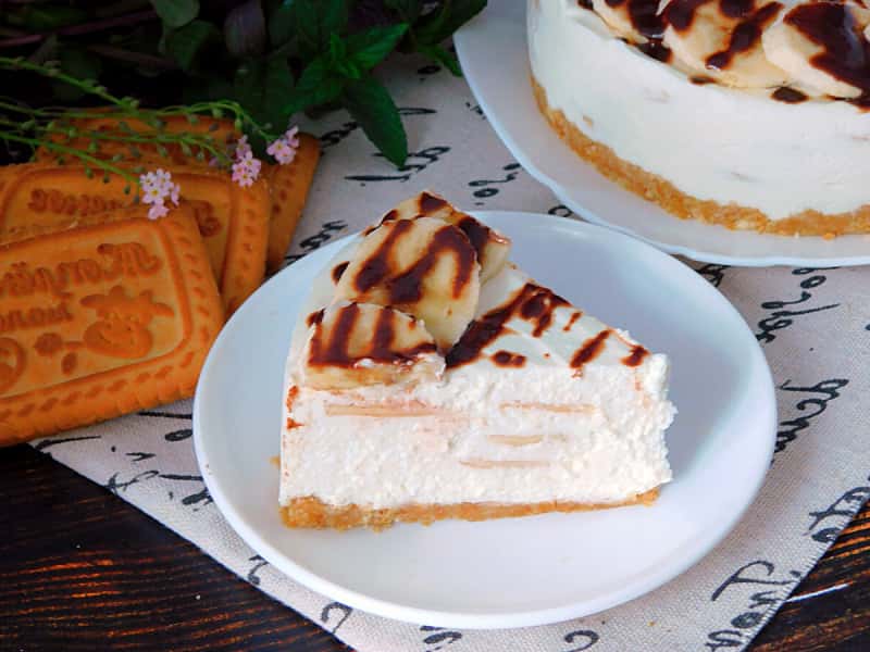 Готуємо ніжний і легкий десерт, на столі повітряний банановий торт. Зручно, що все можна зробити швидко і без випічки. В основі корж з пісочного печива, а на ньому шар сирного крему з шматочками бананів. У жаркий день можна прибрати десерт на годину в морозилку для кращого охолодження.