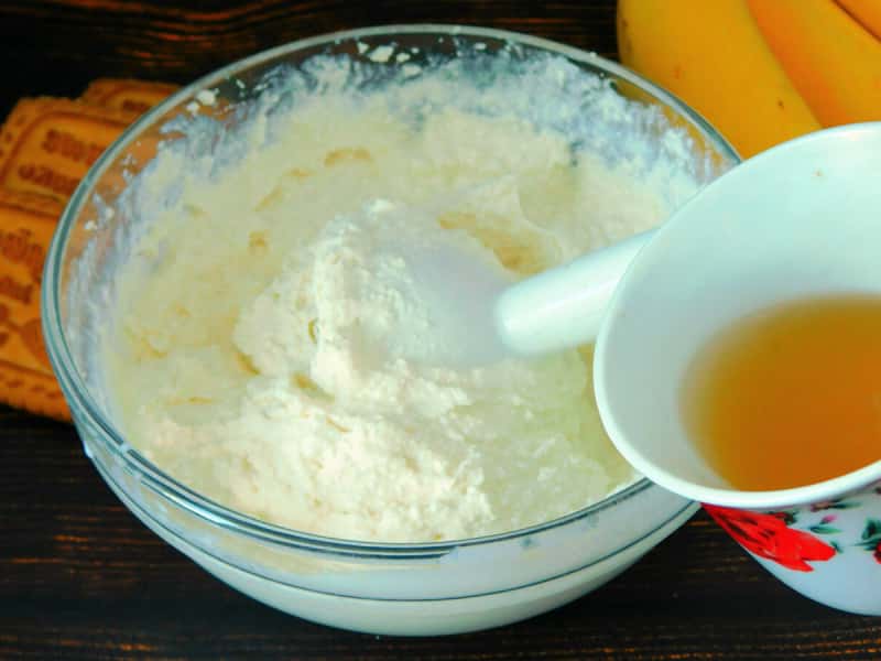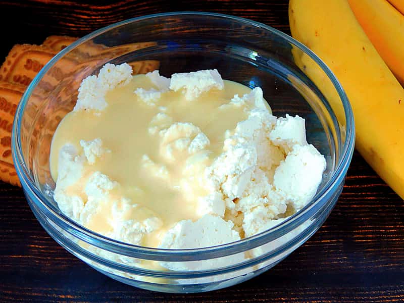 4. У миску викласти сир, тут використовується досить вологий і не сильно крупинчастий. Додати згущене молоко.