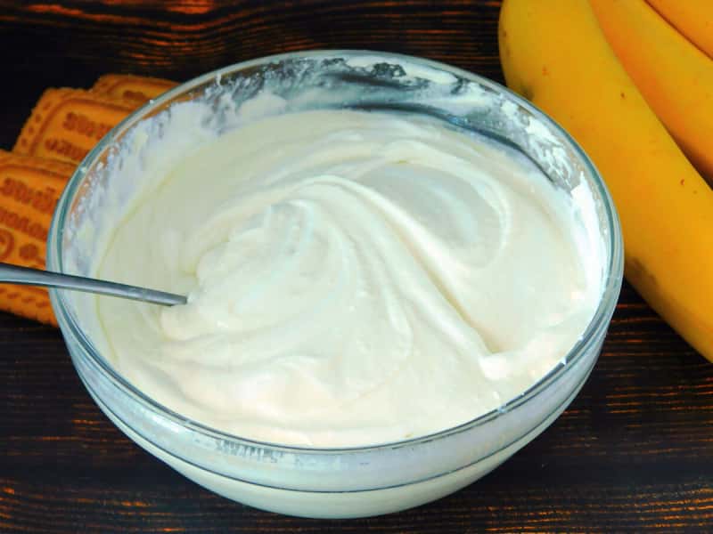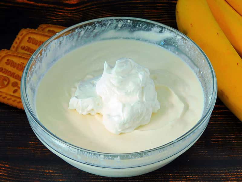 6. Жирні вершки збити окремо і викласти їх в начинку. Перемішати ложкою.