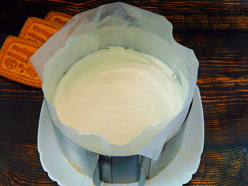 3. Боковинки кулінарного кільця, тут діаметр 20 сантиметрів, застелити целофаном. Поставити кільце на тарілку і висипати крихту печива. Руками або склянкою добре утрамбувати рівномірним шаром. Прибрати в холодильник.
