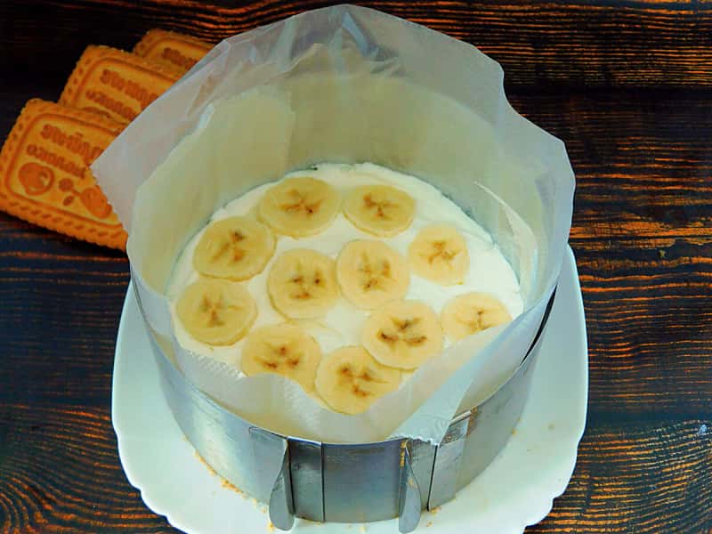 8. Так, чергуючи шари бананів і сиру, зібрати торт. Поставити в холодильник на 5-6 годин, щоб десерт застиг.