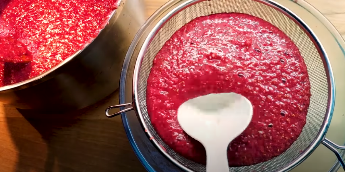 Дуже зручно перетирати ополоником, який повторює форму сита, виходить швидко та просто. Сильно не притискайте, через сито виходять дрібні кісточки.