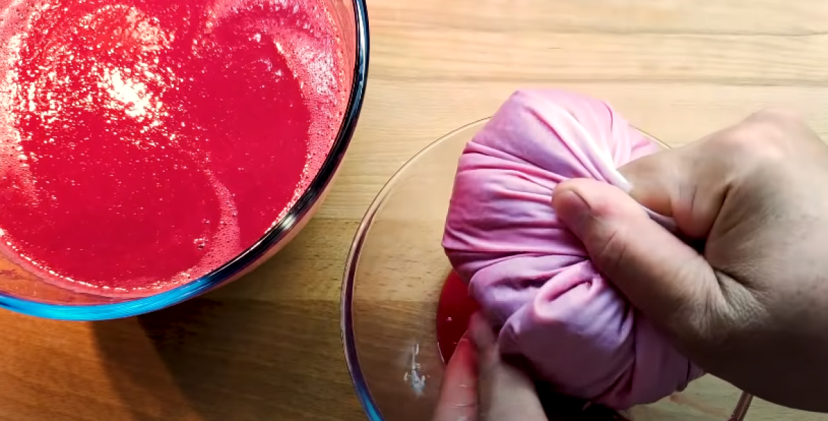 Тому беремо невеликий відрізок тканини, поміщаємо залишки з малини і віджимаємо сік, це дуже легко. Отримуємо цілу склянку соку.