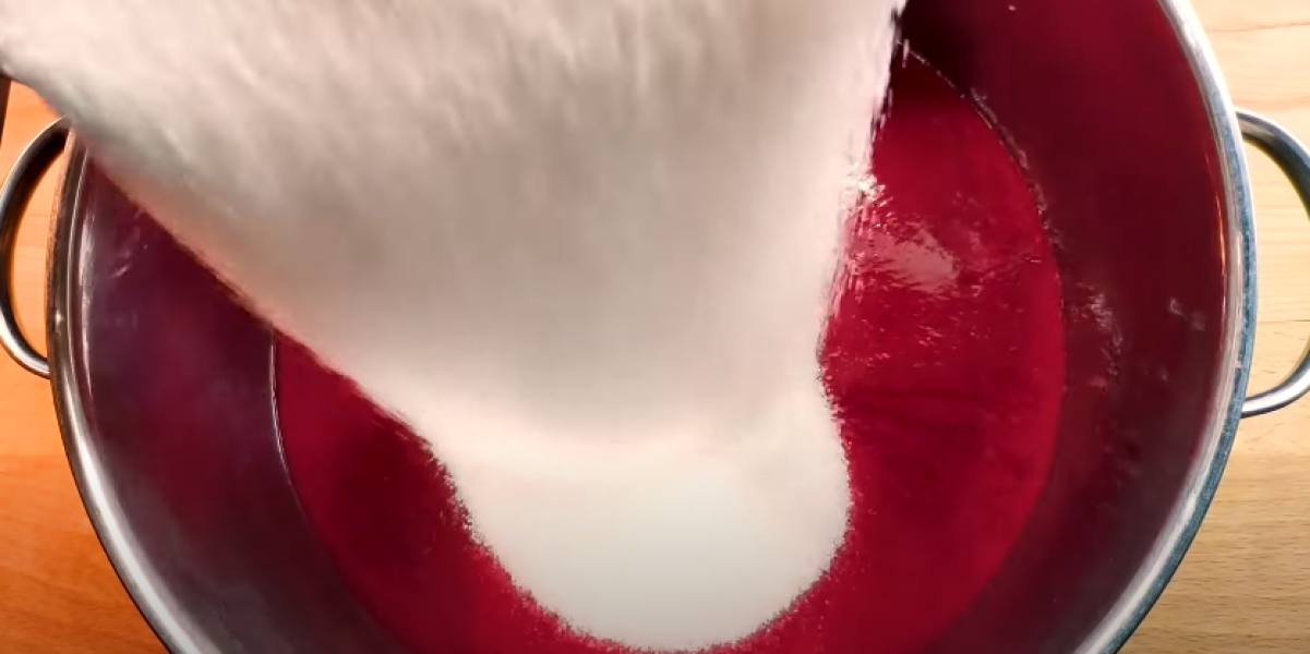 3. Каструлю обполіскуємо від кісточок і переливаємо в неї сік-пюре. Всипаємо цукор із розрахунку на кілограм малини пів кіло цукру.