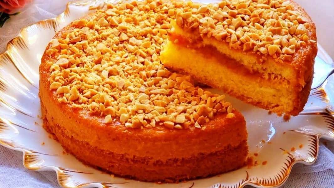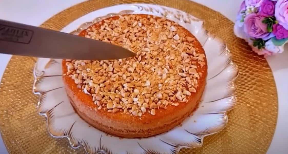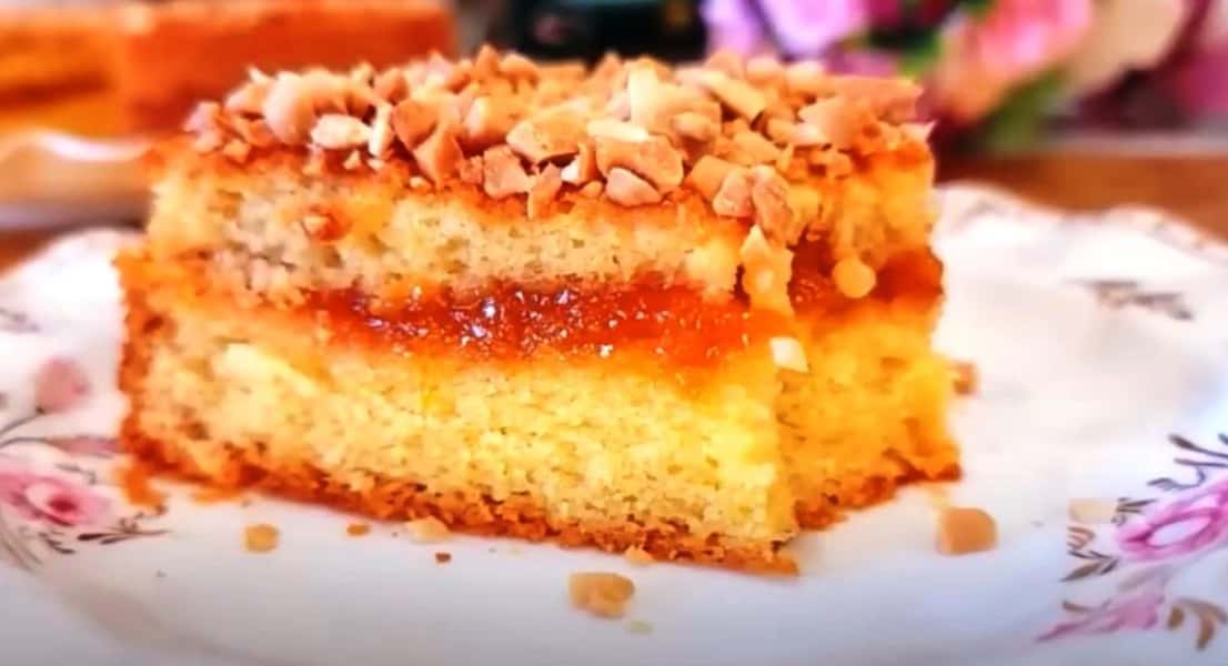 Охолоджуємо пиріг, змащуємо зверху варенням і обсипаємо подрібненими горіхами на ваш смак, волоськими або арахісом, мигдалем.