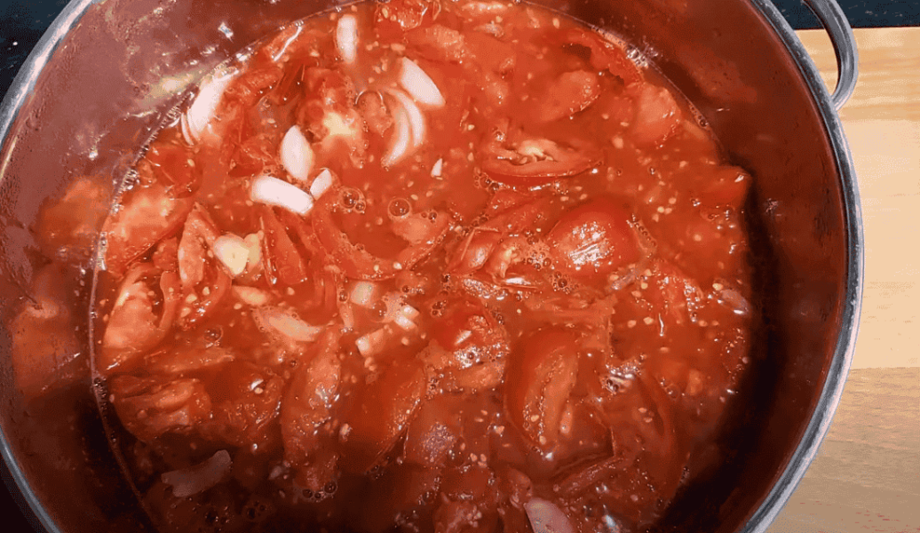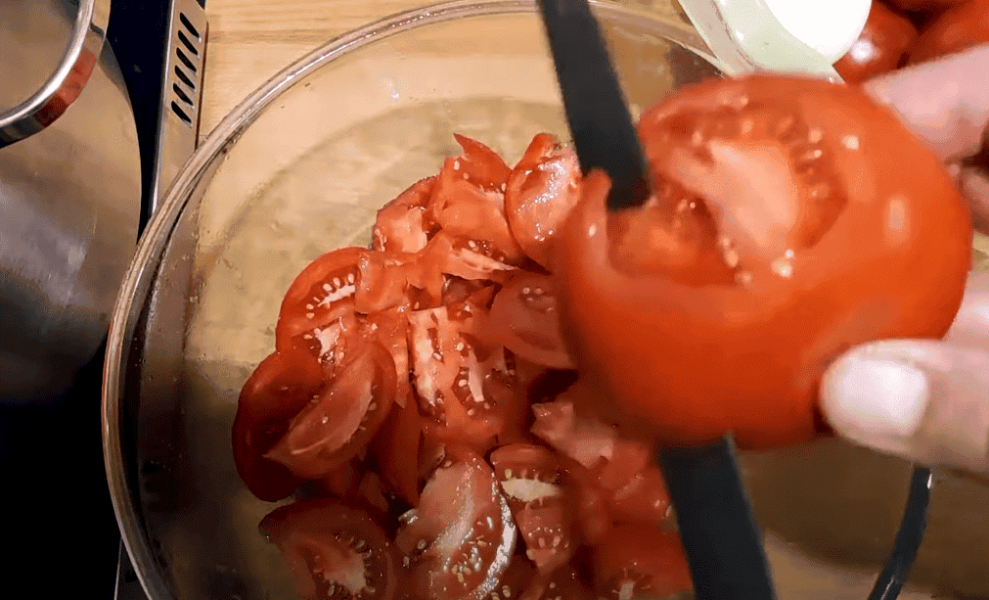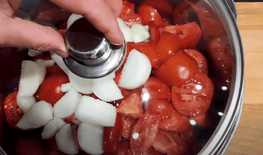 2. Цибулю 250 гр нарізаємо довільно і додаємо до помідорів. Накриваємо кришкою, щоб швидше все розпарилося, потужність плитки максимальна.