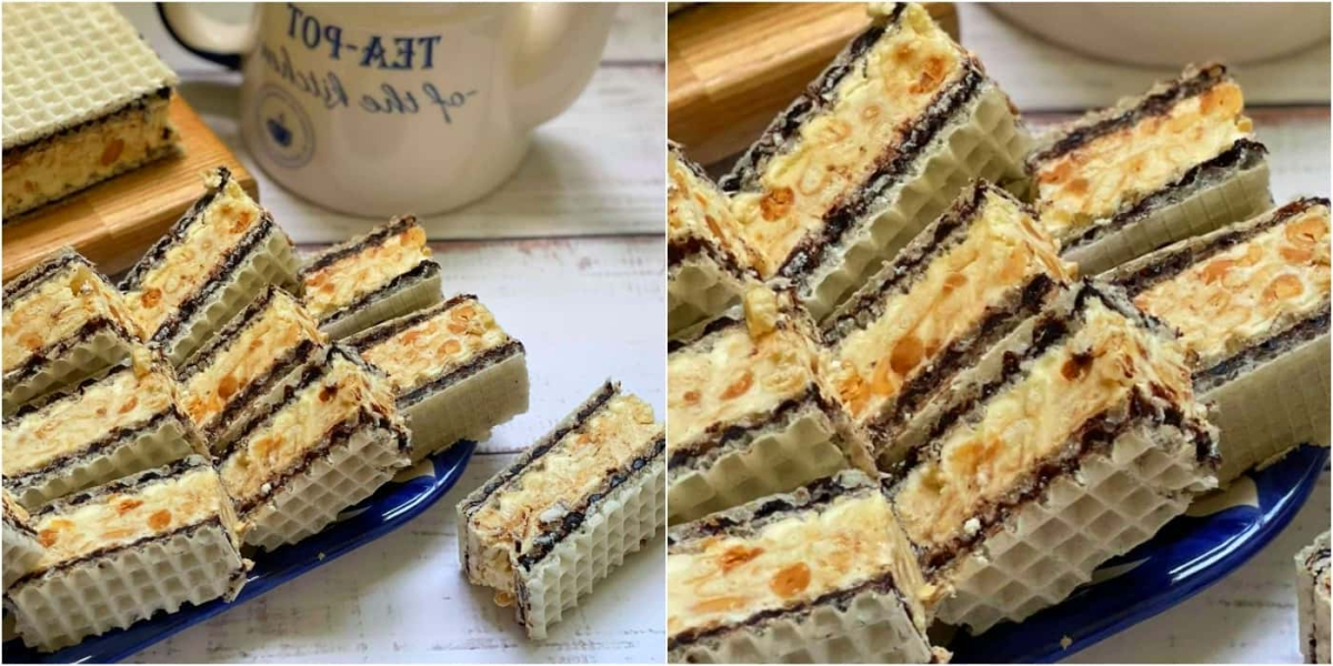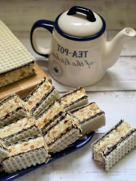 До крему, який залишився, додати подрібнене печиво «Марія» і горішки. Все гарно вимішати і викласти на одну пару вафель. Зверху накрити другою парою і добре притиснути.