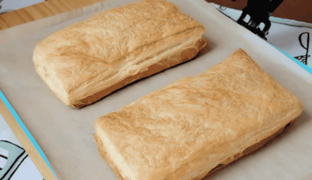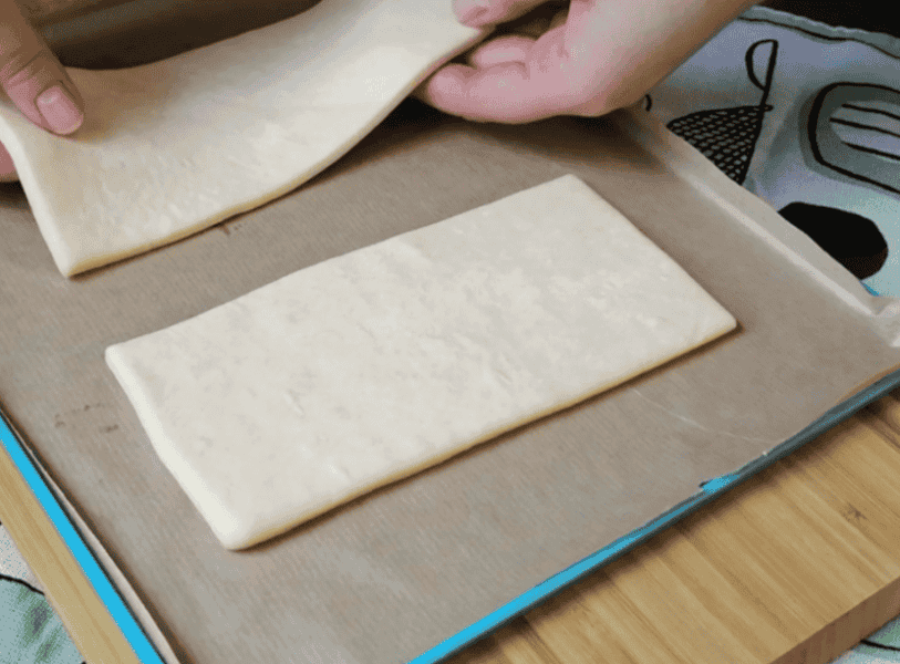 Готове листкове тісто потрібно заздалегідь розморозити. Класичне упакування листкового тіста складається з двох прямокутних пластів тіста. Ділимо кожен пласт на дві рівні частини і викладаємо на деко застелене пергаментом.