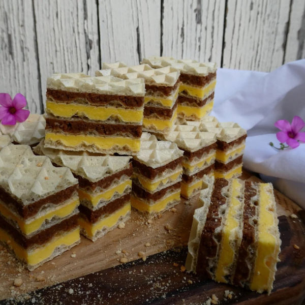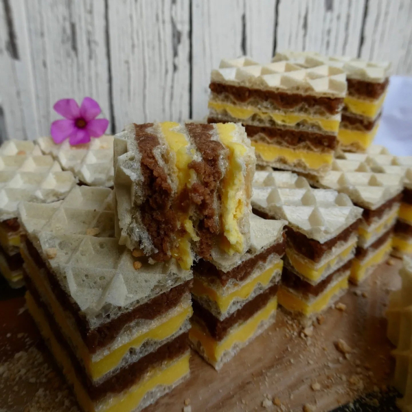 Начиняйте вафлі по черзі то світлою, то темною начинкою, як на фото.