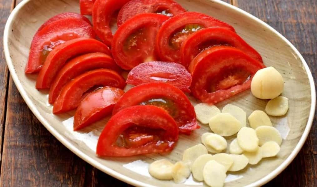 Очищаємо зубчики часнику. Нарізаємо тонкими пластинами. Добре моємо помідори. Нарізаємо їх невеликими часточками.