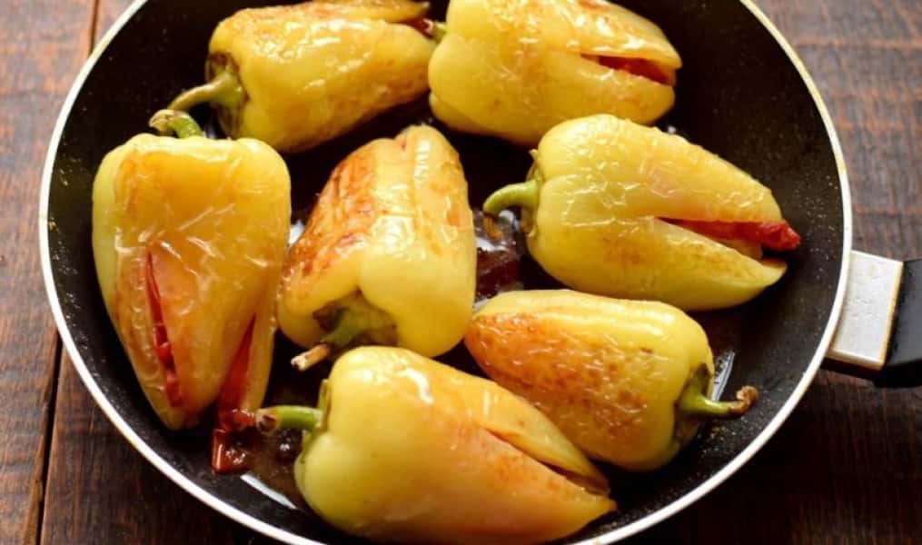 Викладаємо фарширований овоч на розігріту сковороду із олією. Присипаємо його сіллю. Готуємо на середньому вогні під кришкою до рум’яності, періодично перевертаючи перці іншою стороною.