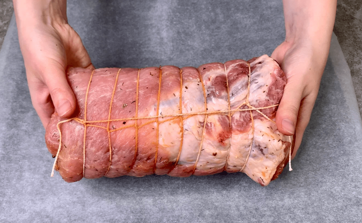 5. Присипаємо тертим сиром, щільно загортаємо в рулет і зв’язуємо кулінарним шпагатом.