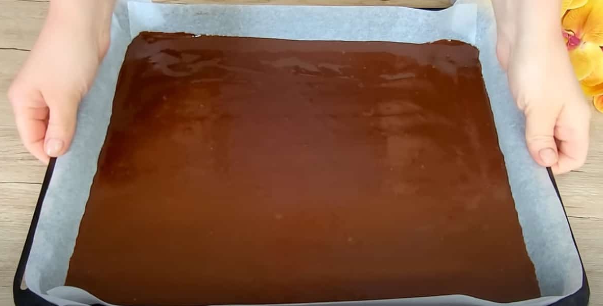 Перелийте тісто у форму, застелену пергаментом, і рівномірно розподіліть.