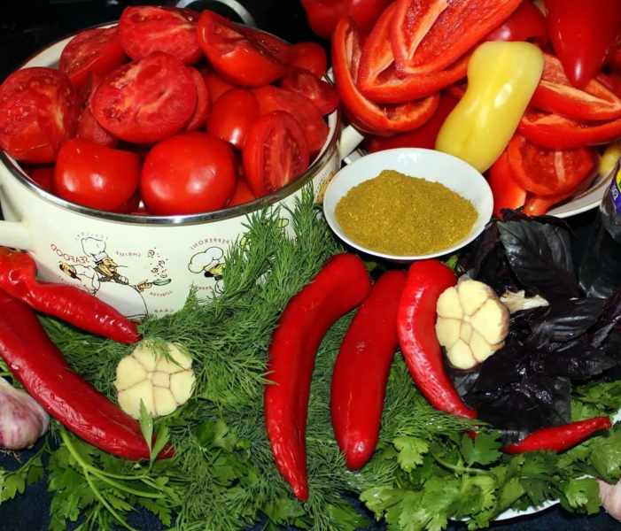 Помідори 🍅, солодкий перець 🌶 і гіркий перець 🌶, часник і зелень 🌿 перемолоти блендером або в кухонному комбайні. Проварити 15 хвилин.