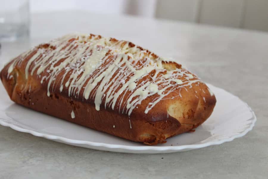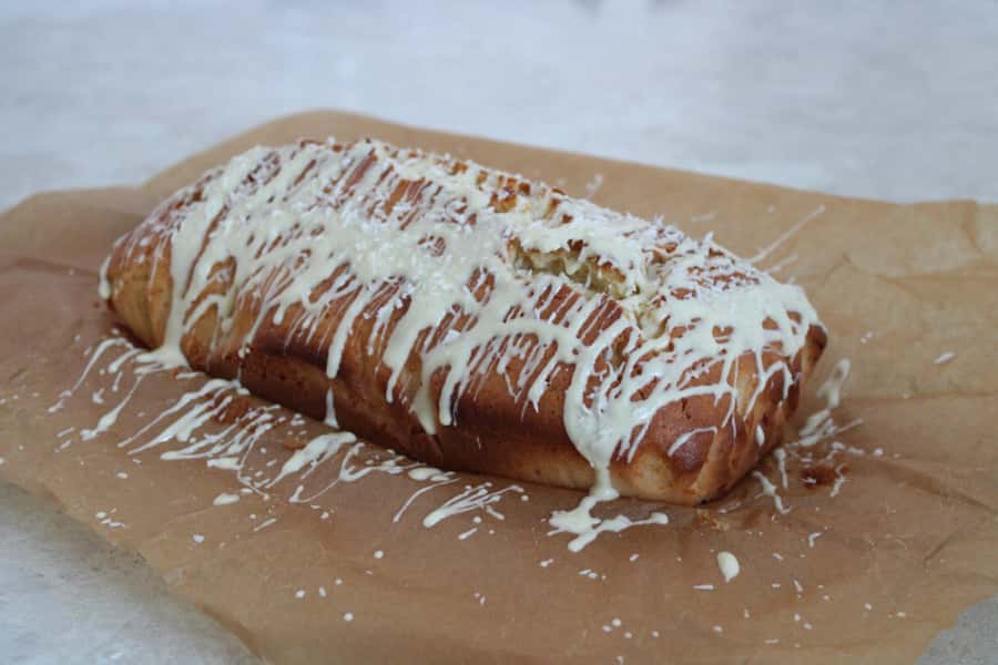 Даємо кексу трохи охолонути і можна перед подачею трохи прикрасити. Наприклад, полити розтопленим білим шоколадом і посипати зверху кокосовою стружкою.