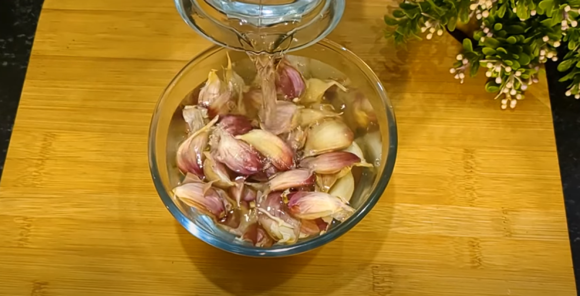 3. Часник чотири великі головки розбираємо на зубки і заливаємо теплою водою на 5 хвилин. Так почистити часник простіше. Отримуємо 200 грамів.