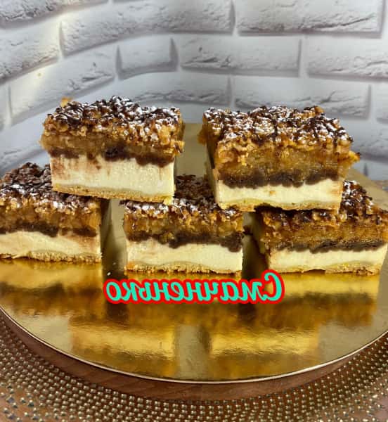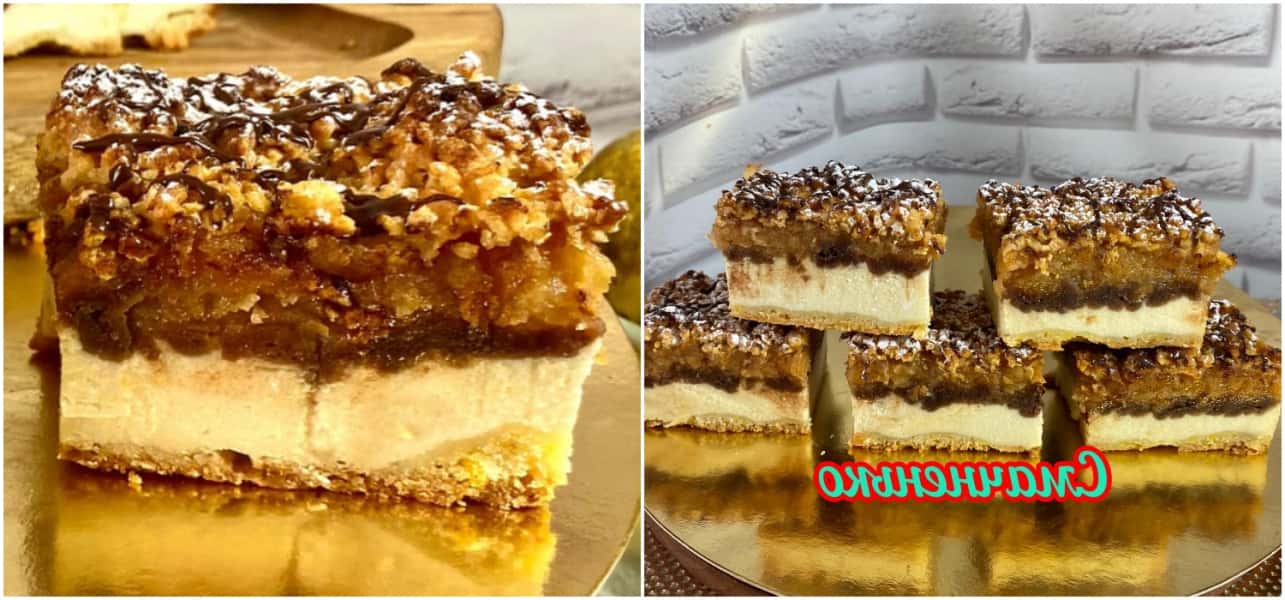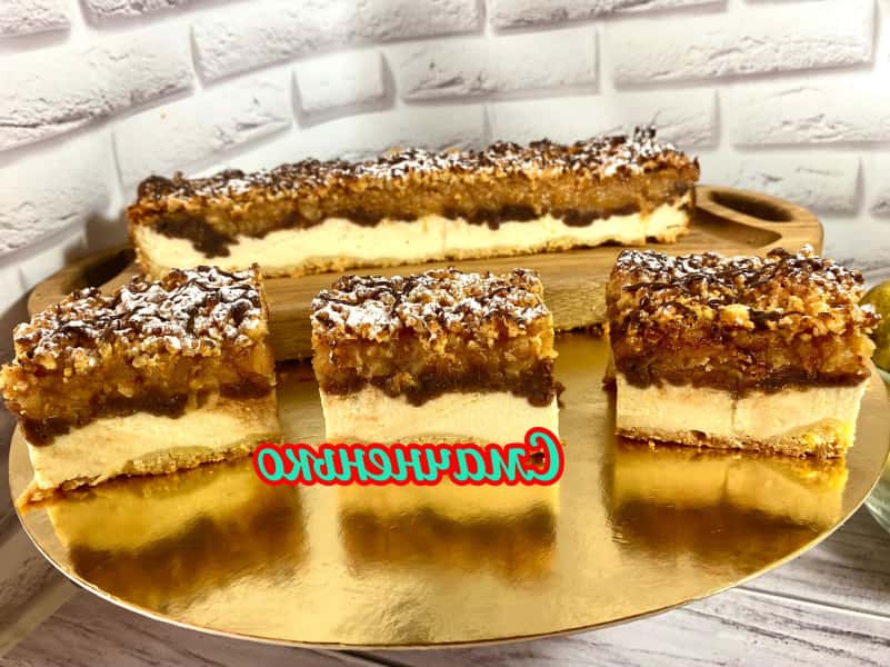 Тут не має крему, печеться одним коржем. Яблучна начинка дуже ароматна, волога, підкреслює сирну основу. Добре нарізається і підійде до святкового столу.
