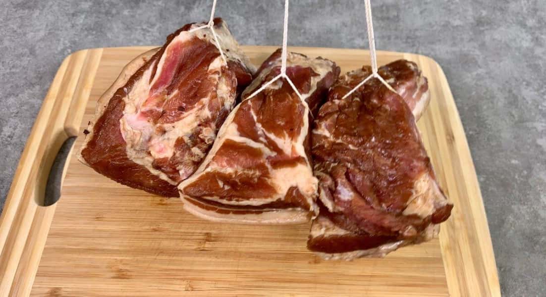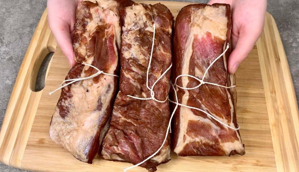 4. Через 24 години дістаємо, обсушуємо за допомогою паперових рушників, обв’язуємо шпагатом і відправляємо в холодильник для висушування на 12 годин. Підвісити в холодильнику можна за решітку (я так і робила).