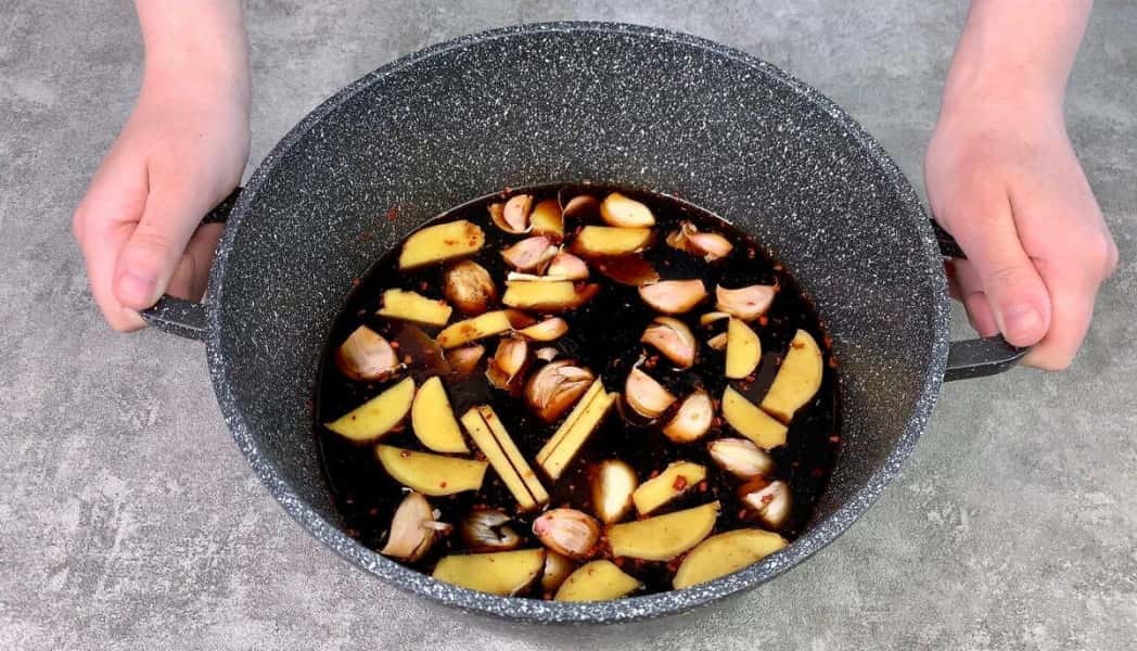 2. У каструлю вливаємо воду з соєвим соусом і додаємо: гострий перець, лавровий лист, цукор, устричний соус, нарізаний імбир і давлений часник (прямо в шкірці).