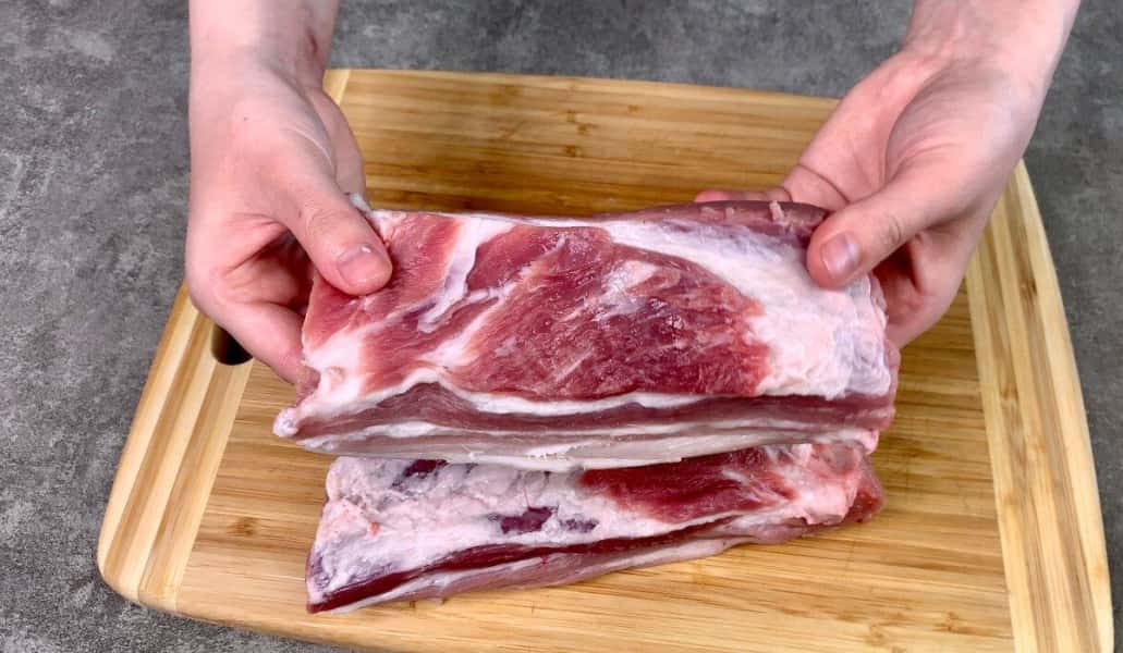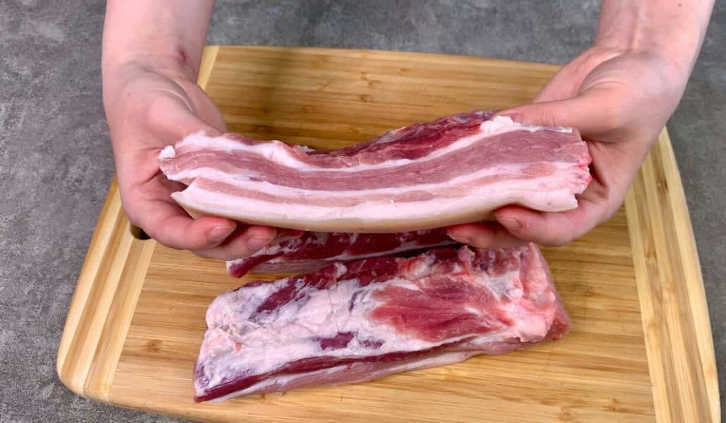 1. Пласт грудинки нарізаємо на зручні шматки, щоб всі їх можна було укласти в одну ємність для маринування.